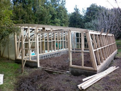 je viens vous faire partager la construction de notre nouvelle serre dans le sud du Chili, à l´entrée de la Patagonie. Le climat ici n´est jamais très froid en hiver mais jamais très chaud en été non plus. Un peu comme la Bretagne mais sans le Gulf Stream: au contraire le Humbolt froid qui vient d´Antartique. 2 m d´eau par an et de gros coups de vent en hiver.