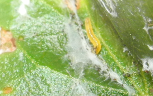 Le traitement ne semble pas concluant: j'ai attrapé hier une nouvelle chenille cachée dans des filaments blancs tissés dans une feuille presque soudée en deux.