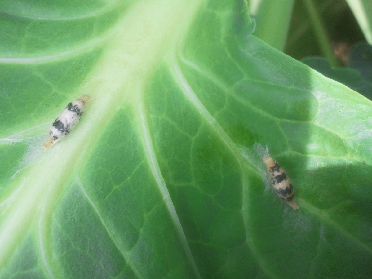 Mes choux de Bruxelles ayant les feuilles mangées, j'ai repéré quelques chenilles de piéride du chou (donc essai d'élimination avec le purin d'ail et de laurier dès ce soir) et en inspectant j'ai trouvé "ça" sur une feuille. Savez-vous de quoi il s'agit ?