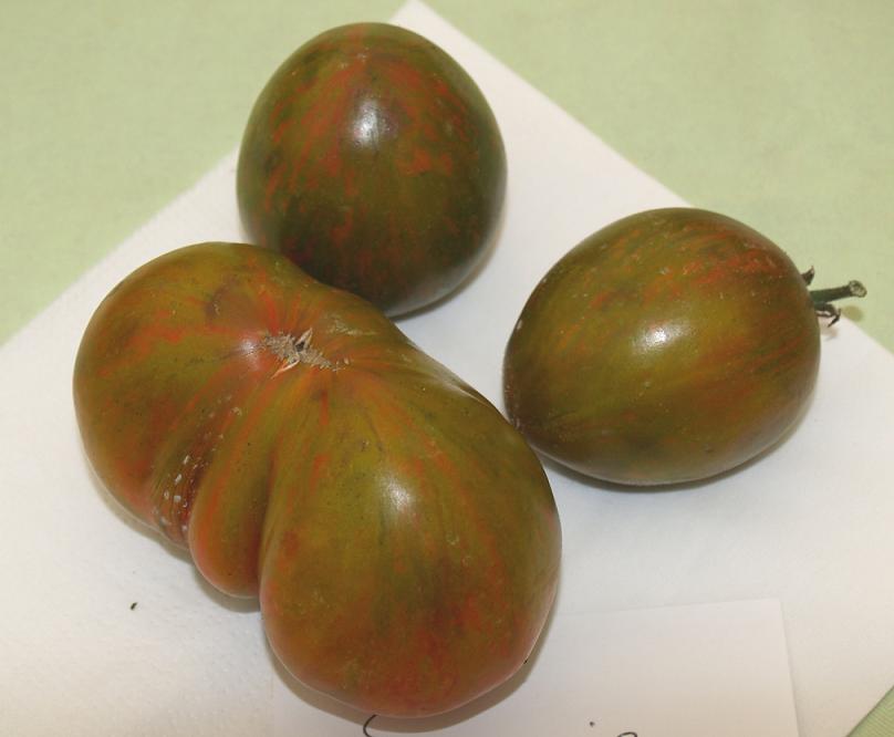 cette tomate verte rayée rouge, à chair jaune/vert et coeur rouge, que j'ai faites dans mon potager à son tout début, porte le nom du chien de l'obtentrice. :smoke: