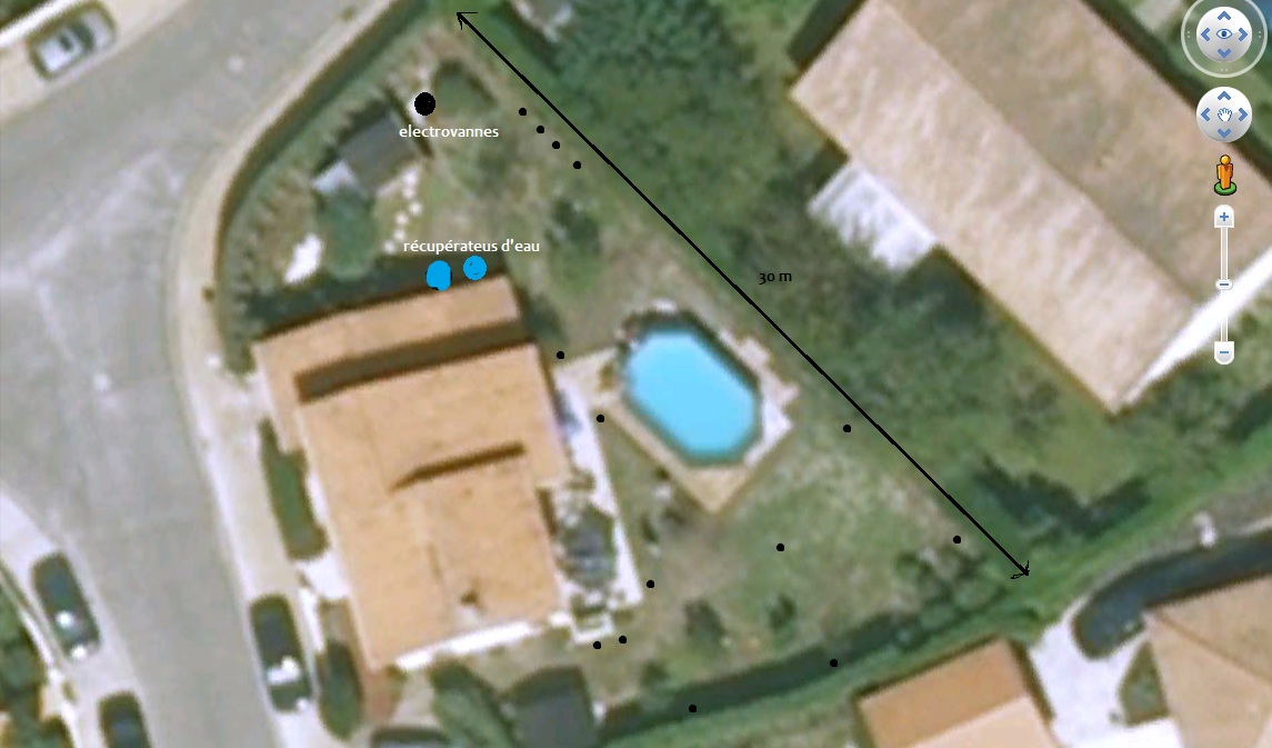 La surface totale à arroser est d'environ 300m² et la distance maximale entre les électrovannes et le gicleur est de 30m.