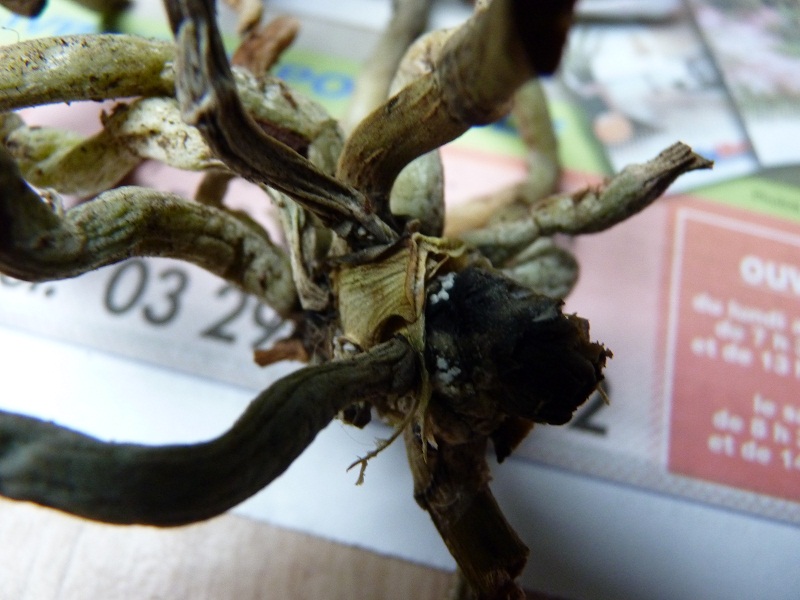 Cet aprè'm j'ai eu la désagréable surprise de voir mon orchidée perdre ces feuilles alors que les racines dans le pot sont plutôt belles : j'ai dépoté la demoiselle et ce faisant je me suis rendue compte que le coeur était noir et avait des traces de moisissures ! je n'ai rien vu venir car pourtant je fais attention lors de mes arrosages ..... d'après tout ce que j'ai lu sur le forum, lorsque le coeur est noir c'est foutu mais vu que les racines ne sont pas pourries je me demandais s'il y avait peut-être un espoir .....