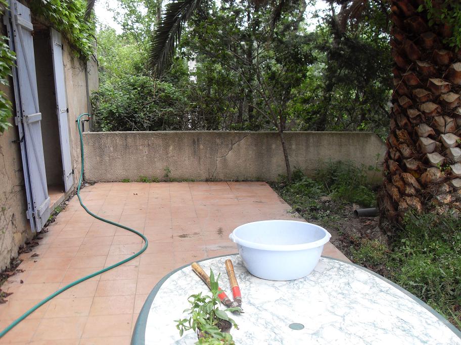 là on voit mieux mais la photo n'est pas récente. contre le mur il y a un micro bassin dans un ancien lavoir un bac et une comporte avec des bulbes. autour du palmier, un parterre de fleurs.