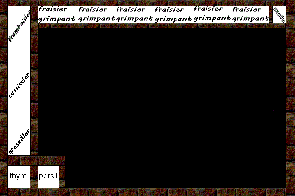 actuellement j'ai des fraisier, un framboisier, cassissier et groseiller, tout sa sur coter mur ou la séparation avec le voisin, de la menthe dans un coin, et persil et thym pareil sur un rebord, j'ai mis de la mache y'as a peu pres 1 mois mnt et rien na pousser donc bon tanpis