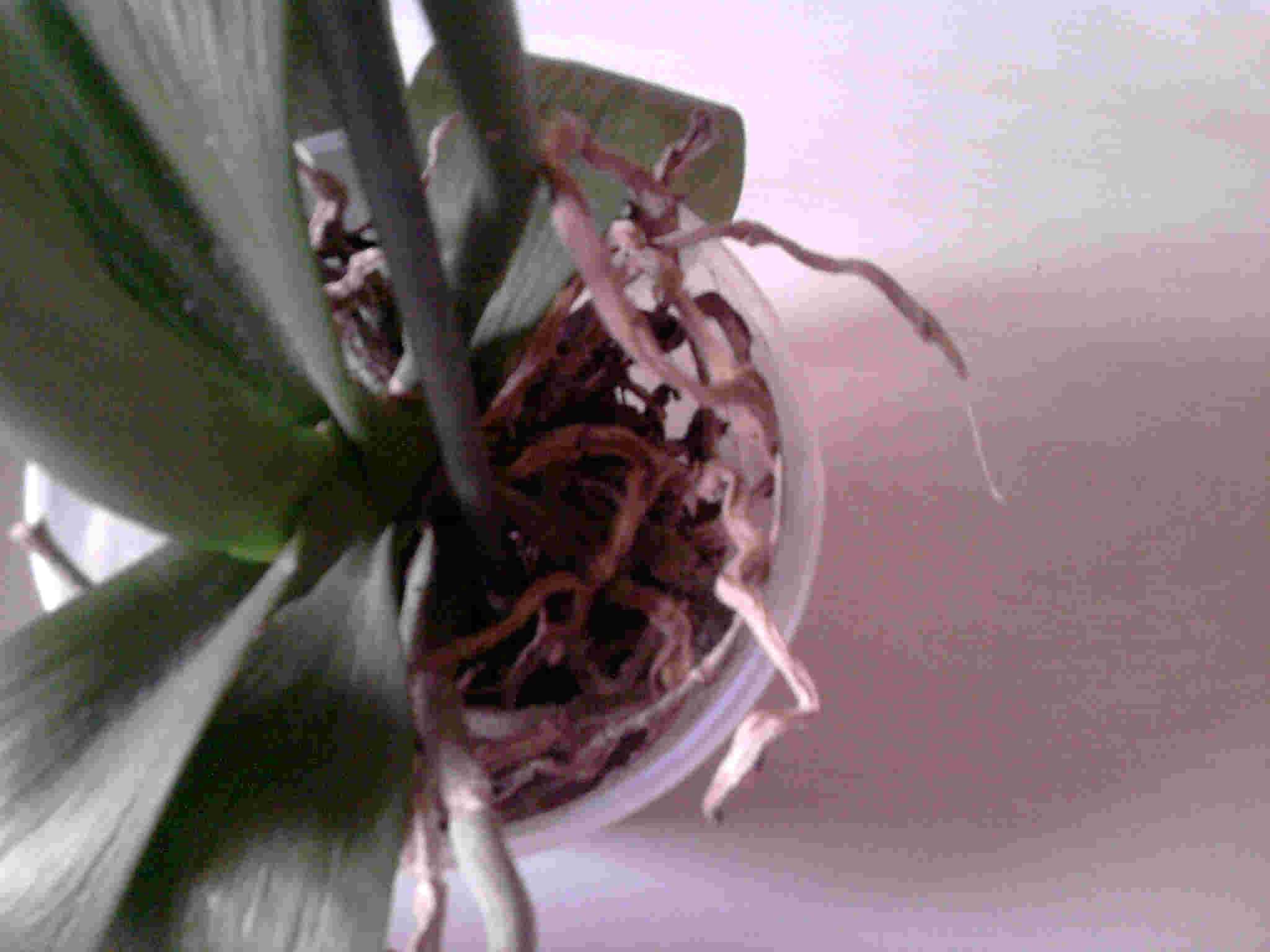 - pour la seconde (blanche) : les racines ont l'air abimées et la plante déshydratée (feuilles molles, non ?). Je me demande si la plante a eu assez de lumière : les feuilles anciennes paraissent larges et arrondies alors que les plus récentes sont très allongées.