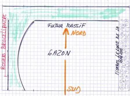 En fait, tu souhaites juste construire ton massif sur la bande du fond (1.20 m x 5 m) ? Sur le côté gauche, il ne s'agirait que de garnir le pied des rosiers, éventuellement ?