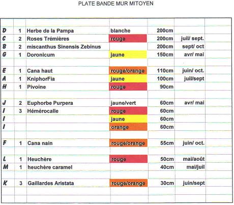 Enfin je viens de faire un schéma de ma plate bande de 6m/1.50m avec les plantes que je compte y mettre. Ce sera en tons chauds: rouge- jaune-orange.
