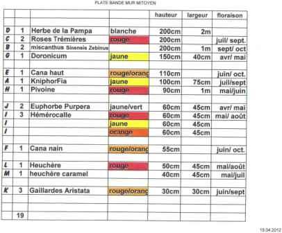 Bon voilà, j'ai (enfin) repris ta liste et ton schéma. Moi, je trouve ça bien ! J'aime bien comment tu as disposé tes plantes de façon irrégulière par rapport à leur taille, chose que je trouve toujours difficile à faire.