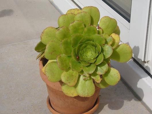 Voici mon aeonium, qui a donc passé tout l'hiver sur la terrasse, et qui semble être aimé des escargots (et des coccinelles aussi mais elles ne lui font aucun mal), c'est bien la version verte de cet aeonium arboreum ?