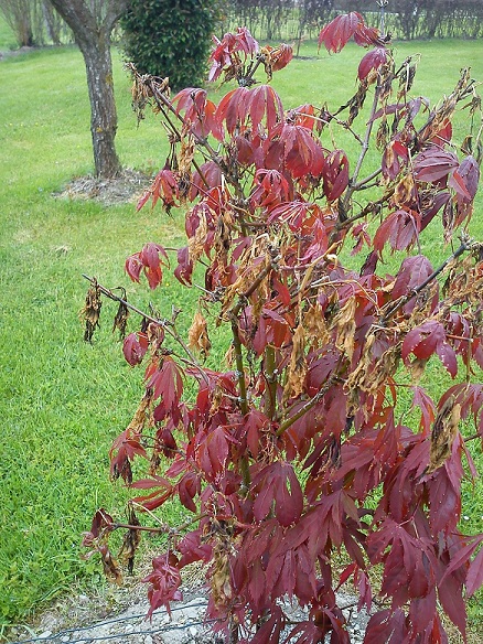 L'an dernier, dans ma région on a eu des gelées ( -2 ou 3°) après que les érables aient été en feuilles. Ces dernières ont été gelées, sont devenues rouge vif puis sont tombées.