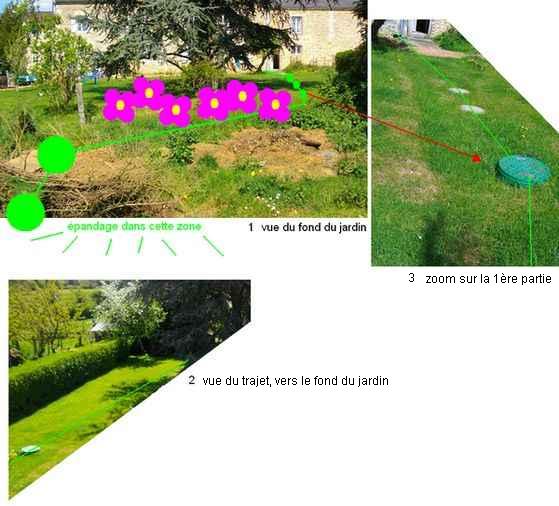Voilà, je possède un jardin assez en longueur (+-10m x 35m de long), avec une fosse sceptique dans le jardin (quasi au milieu), et bien évidemment tout le jeu de tuyaux qui nous emmènent aux regards et à l'épandage (2 regards dans le fond où j'ai mis des poules).