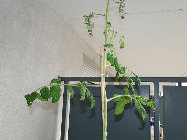 nous avons planté courant mars plusieurs plans de fruitiers dont un plan de tomates cerises bio. Il a énormément poussé, mais il a commencé à flétrir en haut, ses feuilles s'enroulaient sur elles-mêmes. En poussant, elles se sont déroulées mais toutes les tiges sont désormais flétries.