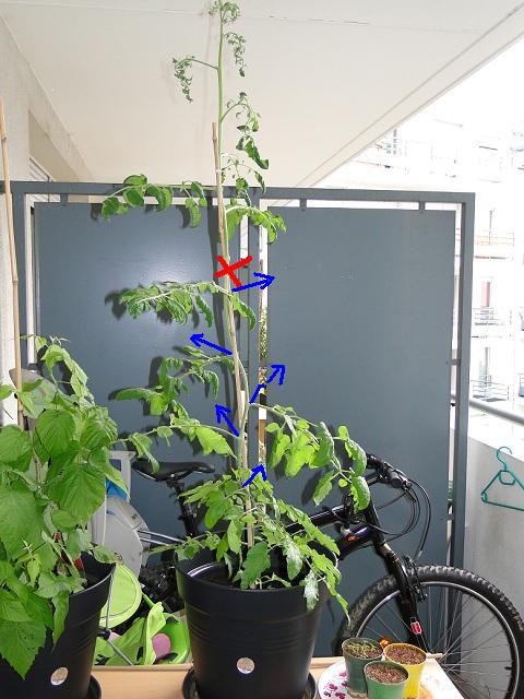 rajoutes du terreau et coupes le plant au niveau de la croix rouge . Ensuite ne touche plus à rien. Il va refaire des tiges que tu ne couperas pas (comme l'indiquent les flêches en bleu )! Lorsque des fleurs apparaîtront, tu secoueras un peu le plant afin d'aider à la pollinisation. 5 secondes par jour!