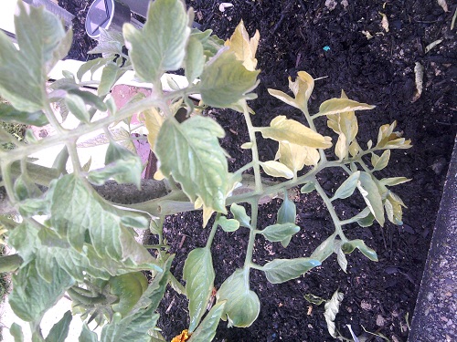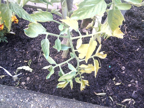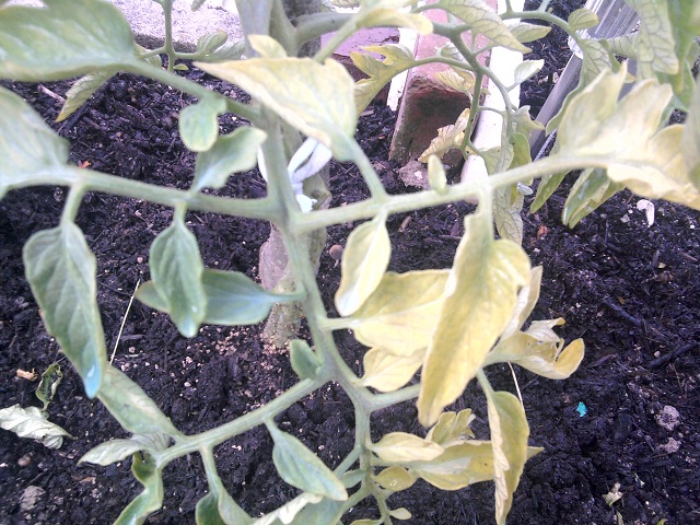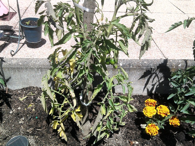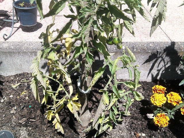 L'un de mes pieds de tomates me pose problème, les feuilles deviennent jaunes sans pour autant qu'elles sèchent, le plant continue à pousser avec fleurs mais la dernière feuille commence aussi à jaunir, c'est un St Pierre ; à gauche un stupice et à droite un St Pierre qui n'ont pas ce problème, les tomates grossissent aussi normalement, du moins c'est l'impression que j'ai; j'ai cherché dans les "maladies" mais je ne vois rien qui puisse correspondre car les feuilles ne sèchent pas, l'arrosage est identique car c'est du gàg, devant il y a des salades, à côté une coriandre en fleurs,un basilic et un oeillet d'inde comme près d'autres plants. photos explicatives la grosse feuille à gauche commence à jaunir aussi ; je pense à une chlorose mais pourquoi uniquement ce plant ?