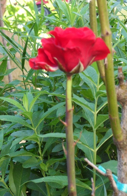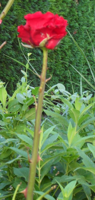 Quant à mon rosier il n'a pas de nom, il provient d'une belle rose rouge d'un bouquet de fleuriste que j'ai mise en terre et qui a eu l'amabilité de faire une pousse.Il y a de cela une bonne quinzaine d'années. A cette époque je ne m'intéressais pas trop aux fleurs, donc pas trop de soins ni de taille ni de greffe ni rien du tout. Maintenant j'ai le temps et je veux le sauver. C'est une chance qu'il en soit là. Je pense que cet hiver il faudra une taille sévère.