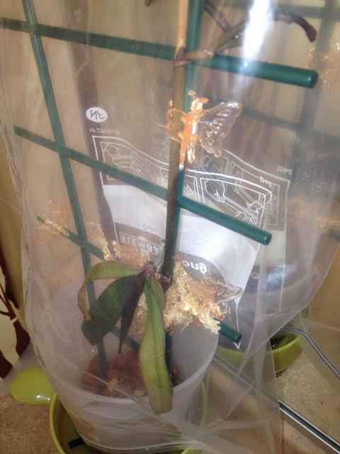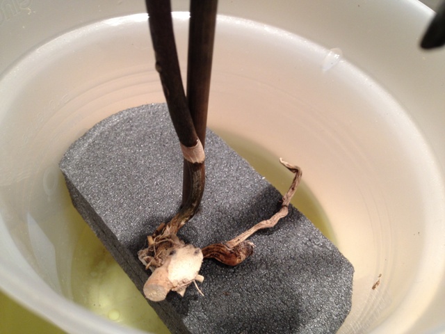 J'ai donc coupé les racines non saines (comme j'avais lu sur internet) et tremper la base dans du fongicide, laisser sécher. Et j'ai appliqué la méthode du sac plastique (un fond d'eau, un sac pour permettre à la plante d'obtenir de l'eau par évaporation).