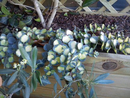 et je viens de voir des dépôts blancs un peu partout (cochenille...?) - photos jointes du 29 JUILLET 2012. J'ai incriminé d'emblée une plante grasse rampante qu'on avait planté à son pied (voir photo) et qui se répend, pensant qu'elle "pompait" toute l'énergie), avant de voir les dépôts blancs... AU SECOURS!!