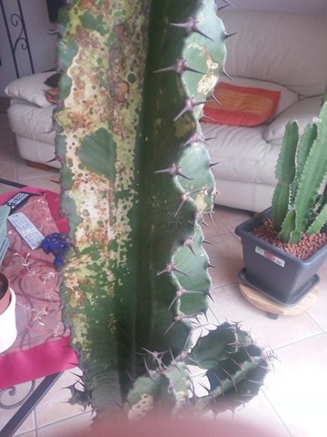 Il ne s'agit pas de Cactus mais d'euphorbes. Ces marques peuvent être dues à un changement d'exposition trop violent (plantes mises au plein soleil du jour au lendemain) ou à un problème d'arrosage. à la rigueur.