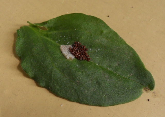 Bonjour. Je viens de trouver ces oeufs dans mon potager sur une feuille de concombre. Est-ce que ça peut être des oeufs de machaon ? Je crois que le papillon ne pond qu'un oeuf à la fois car juste au-dessus j'ai pu observer une chenille-machaon. Peut-être n'y a-t-il aucun lien. J'ai mis la feuille dans un bocal en attendant les renseignements.