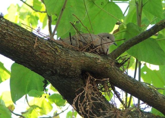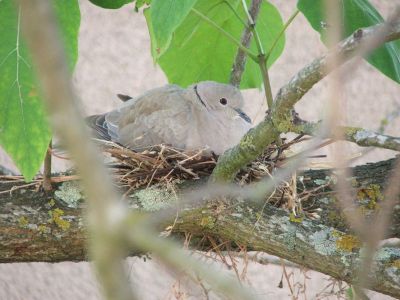Une tourterelle a niché dans mon grand catalpa juste à 5m du balcon. Ce n'est pas un oiseau doué pour faire des nids sophistiqués mais là la pauvre je crois qu'au premier coup de vent tout va être emporté.
