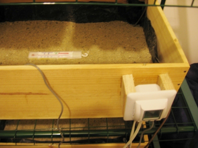 La serre chauffante est faite avec un caisson de vin 50 x33 cm, un câble chauffant pour les reptiles et un thermostat pour sol chauffant .