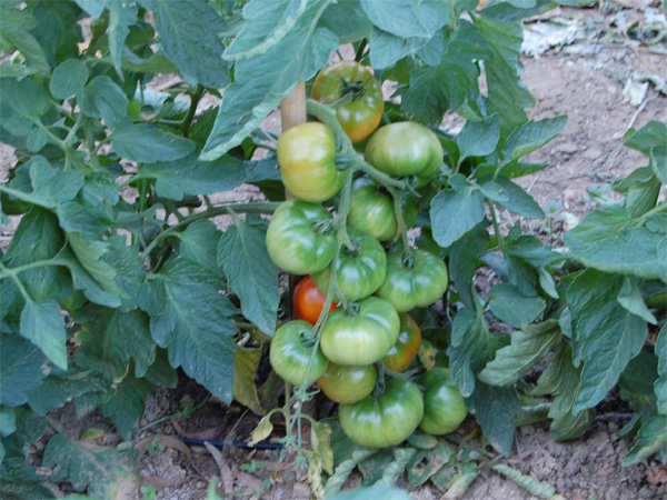 Les différences d'attaque du mildiou ont semblé dépendre de l'ameublissement du sol: mieux j'avais travaillé, moins il y a de feuilles jaunes et plus le pied est puissant. Aucun n'est mort, aucun fruit attaqué.
