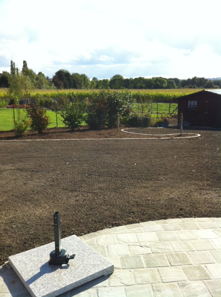 Je voudrais commencer à droite au bout de la 'corne' par un arbuste plutot bas (genre spirée magic carpet), puis partir vers la gauche avec des arbustes de plus en plus haut pour atteindre +/- 2m au milieu du cercle (la ou il y a le piquet avec le cable électrique). Quand je dis 'des', je me rends bien compte que ce sera 1 ou 2 ...
