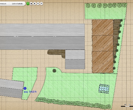 Les zones que je voudrais arroser sont en vert, y compris la bande de 1m de large à droite...