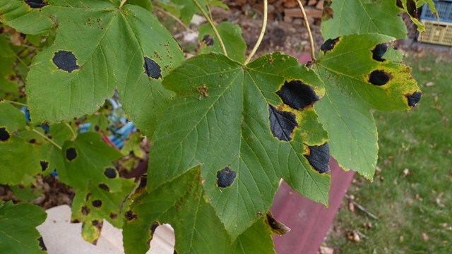 Voici plusieurs photos d'un érable (je pense qu'il s'agit d'un érable) dont les feuilles sont tachées.