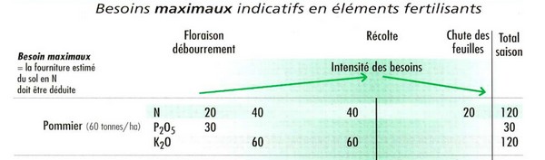 A ce que j'ai pu comprendre, ils proposent d'apporter, pour des pommiers déjà installés bet en production, NPK/ha = 100 / 40 / 150 (tableau 1 pour 40 t./Ha)