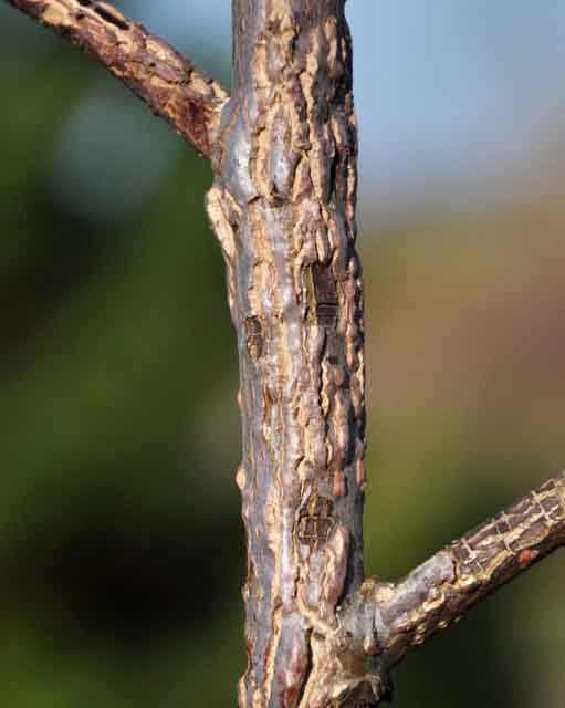 la maladie progresse du tronc vers les extrémités des branches mais sans les atteindre complètement; en fait elle semble suivre la croissance des branches.