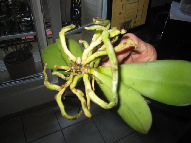 J'aimerai quand meme savoir ce que vous pensez de l'état de ma phal ... je vous mets une photo (avant coupe de racines !) ...