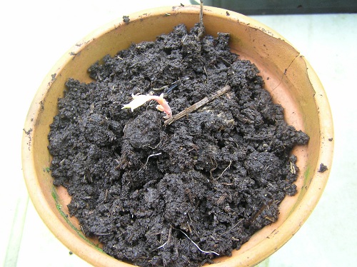 J'ai une benne de brouette remplie de fumier où m'attendent pour le printemps 3 pieds de bégonias. Le temps étant clément cette année je l'ai rentrée tardivement à la cave. Hors aujourd'hui en regardant si la terre n'est pas trop sèche........