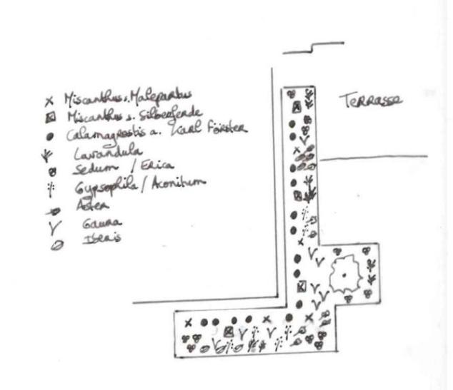 4 Miscanthus Silberfelde, 5 Miscanthus Malepartus, 14 Calamagrostis Karl Foerster, 42 sedum coral carpet ou 30 erica white perfection, 20 Lavandula Edelweiss, 15 gaura Whirling Butterflies