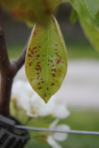 J'ai 1 de mes poirier (planté il y a 2 ans) qui a des taches rouges sur les feuilles + feuilles qui s'enroulent.