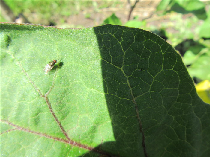 Avec le retour de la chaleur ,depuis deux jours ,je vois de nouvelles feuilles attaquées .Il s'agit d'une mouche que j'ai réussi à prendre en photo ,malheureusement je n'arrive pas à prendre des choses très fines avec mon appareil: