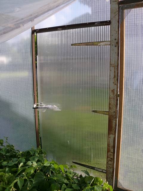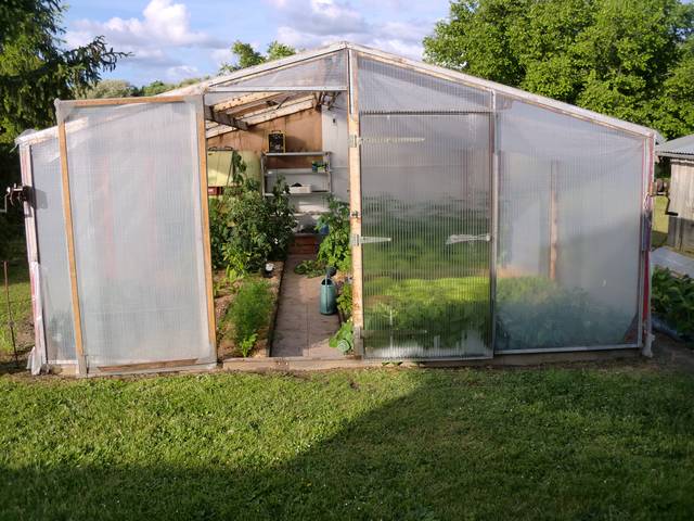 Voici le devant avec 1 porte manuelle qu on ouvre pour aller dans la serre ou quand il fait tres chaud plus une porte a ouverture automatique, quand il fait pas trop chaud elle se gerre toute seule