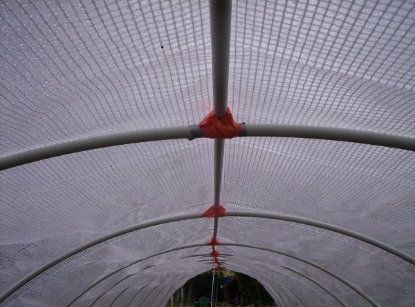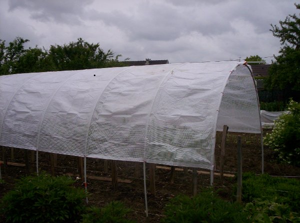 Bâche attachée à chaque arceau , une cordelette nylon par dessus la bâche tous les 2 arceaux.