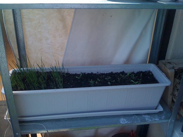 Là c'est ma coriandre il y a deux semaines en compagnie de ma ciboulette, elle est bien au frais ou je l'ai mis, et dès le mois d'octobre, une fois que j'ai descendu les meubles d'été à la cave et fait de la place sur le balcon, je mets ce pots contre le mur bien exposé au soleil pour en avoir toute l'année.