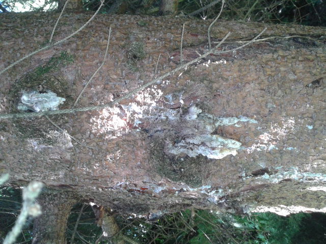 Les amas de résine sèche indiquent la présence d'insectes dans l'aubier depuis assez longtemps.