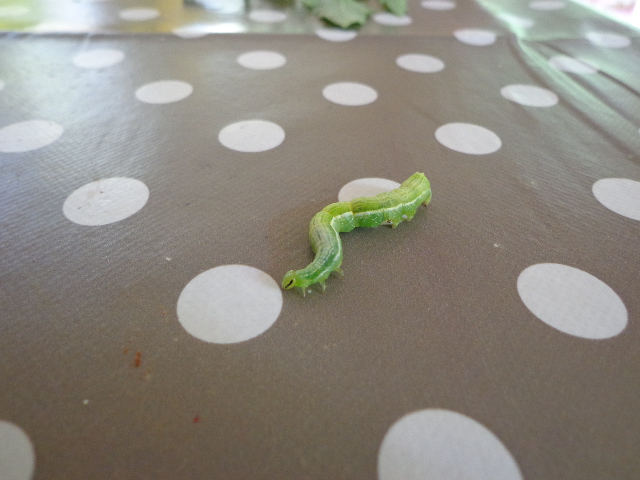 Une chenille verte, toute petite d'abord puis grosse jusqu'à 4 ou 5 cm, s'attaque actuellement à nos tomates "yellow pear", nos haricots verts (nains) et aux jeunes plants de courgette, déjà malmenés par la mouche mineuse. Nous passons en revue le maximum de feuilles chaque jour pour les ramasser mais beaucoup arrivent à se cacher, si bien que la récolte s'appauvrit beaucoup.