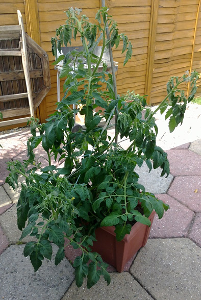Mes chou chou sont des tomates cerises, elles sont dans des pots en plastic dans lesquels j'ai mis du terreau et quelques orties au moment du rempotage. En début de saison, je les arrosais 2 fois par semaine. Depuis une dizaine de jour il fait si chaud (elles sont en plein soleil toute la journée) que je les arrosais une fois tous les deux jours. Mais il semble qu'elles en veulent plus comme le montre la photo (contrôle + sur la photo pour l'agrandir), pourtant je ne voudrais pas faire pourrir le pied. Alors, j'ai grand besoin de vos conseils avisés. Merci.