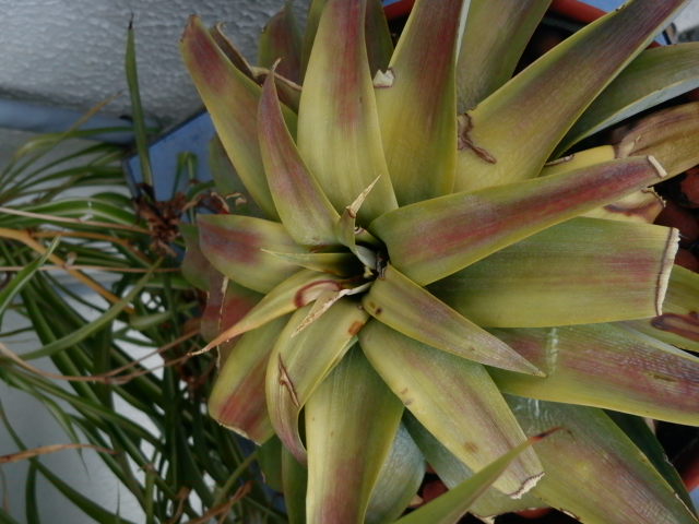 J'avais mis aussi mes têtes d'ananas dehors et les feuilles ont jaunies voir même violettes mais ils ne semblent pas sèches.