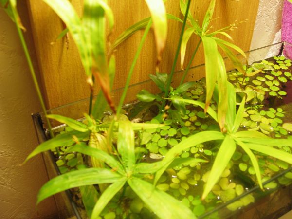 Sur les photos on voit bien que les feuilles les plus touchées sont celles les plus grandes les plus près de la source de chaleur celles dans l'eau n'ont pas les bouts jaunes, par contre si elles sont plutôt vert clair d'un vert pas très franc tu peux aussi lui donner un petit coup de pouce en mettant de l'engrais pour les plantes d'aquarium qui n'est pas nocif pour les poissons.