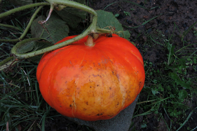 il y en a un qui a poussé... il continue, mais voilà, j'aimerai bien savoir s'il est mûr (ou au moins si je peux le couper)... parce que là, il pleut des cordes, la météo n'est pas très optimiste et à force, j'ai peur que mon unique potiron ne moississe... même je l'ai placé sur un pavé pour éviter qu'il ne soit en contact avec la terre.