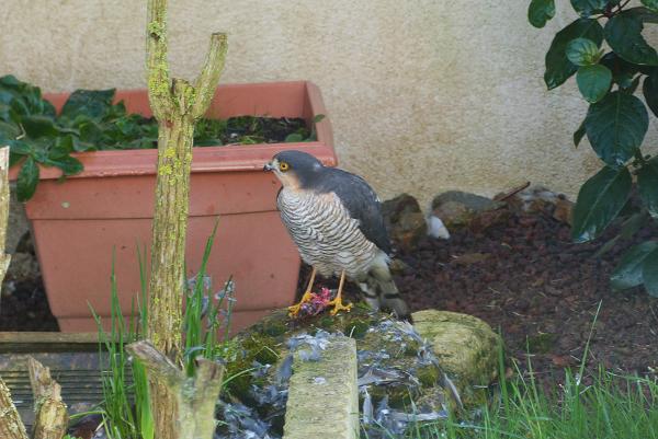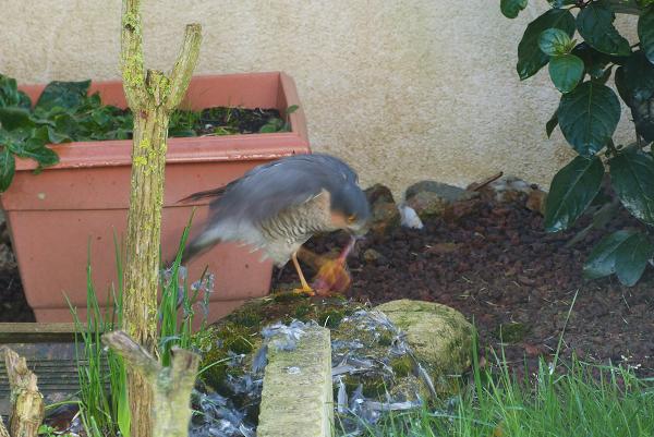 Et les "petites plumes trouvées dans le jardin" sont typiques de l'épervier qui plume ses proies (cela s'appelle une plumée) et hante assez régulièrement les jardins.