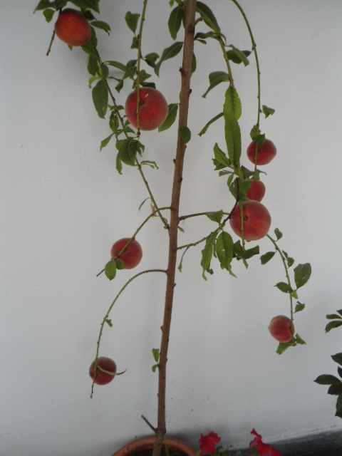 , 58 (oui, j'ai les calculé), vert - rouge (ils rougissent au soleil), il se supporte très bien. Je pense d'acheter un pêcher nain crimson, avec le feuillage rouge….J’ai aussi un cerisier nain bigarreau sweetheart en plein terre, planté cette hiver, il a donné 20 cerises. Par contre, je voudrais remplacer un vrai abricotier er vrai prunier (ils sont jeunes) par les nains, en plein terre. Je me suis rendu compte, que il va grandir trop et mon jardin est petit….J’ai que 100 m2. Quelle taille peut faire des arbres nains en plein terre ? Je voudrais bien qu’ils grandissent jusqu’au 2-3m maximum ? Mais si ils restent 1 – 1,5 m d’hauteur, c’est trop peu, car mes tomates sont presque 2,5m