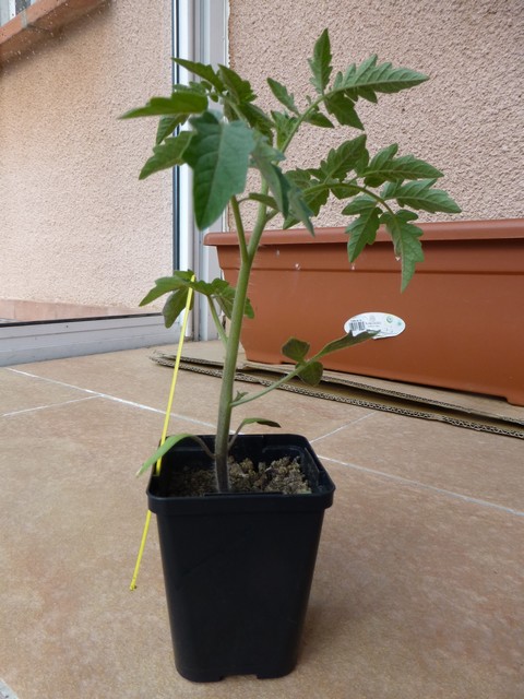 Tout en bas, les cotylédons. Puis, sur la droite de la photo, un gourmand.
