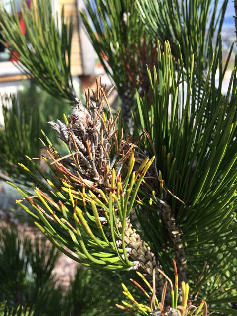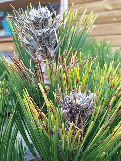 J'ai un pin de bosnie, ainsi qu'un mugo (a un différent endroit du jardin) qui ont tous les deux les même symptômes depuis deux ans.