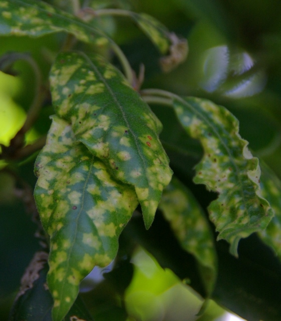 j'ai deux chênes verts (enfin, je pense) dont une bonne partie des feuilles est tâchée ou recroquevillée : Au dos, probablement des parasites en tout genre, trop petits pour que je parvienne à bien les distinguer : Les chênes risquent-ils de péricliter ? Les arbustes voisins (lauriers-tin principalement) sont-ils en danger ? Si oui, que me conseillez-vous ?